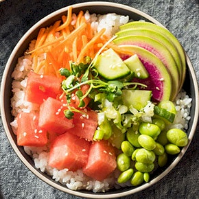 Poké Mahi serves high quality Hawaiian Poké bowls with your choice of protein from spicy tuna, salmon, ahi tuna, octopus, shrimp and more, served on your choice of rice, corn chips or greens base, then topped off with your choice of veggies, toppings and dressing.