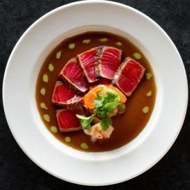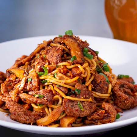 BIRRIA: dipped corn tortilla, brisket, jack, onion, red sauce, cilantro, consomé