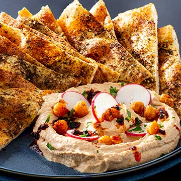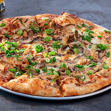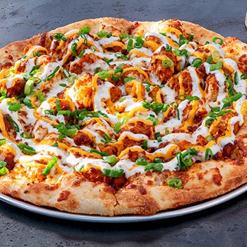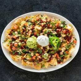 VAMPIRE CARNITAS: cheese-crusted, bacon, garlic, guac, salsa, sour cream