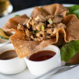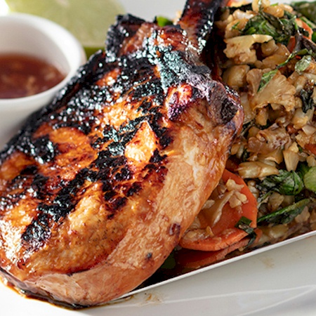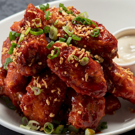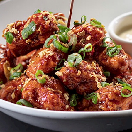 CRISPY KOREAN CHICKEN: gochujang, garlic aïoli, soy ginger, broccoli slaw, green onions