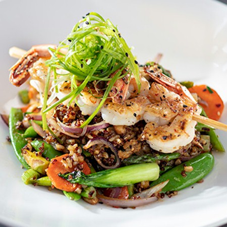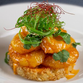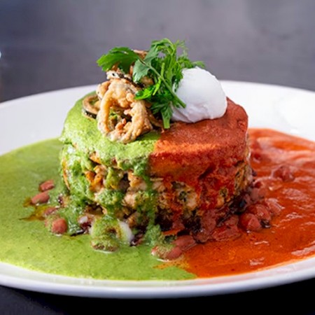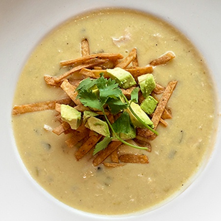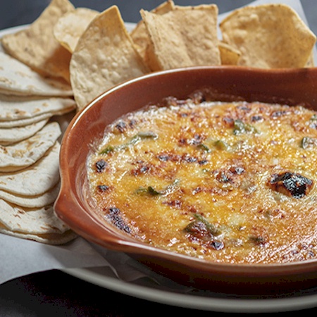 CUMIN CHILI SHRIMP: jack, green sauce, tortilla strips, sour cream, guac, parm, cilantro