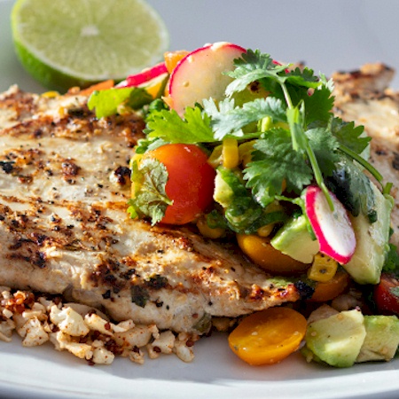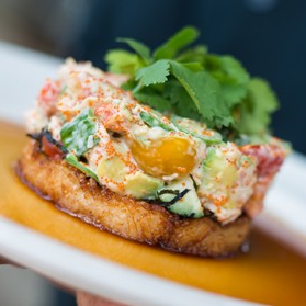 BEER-BATTERED FISH: guac, cabbage, sriracha aïoli, salsa macha, cilantro