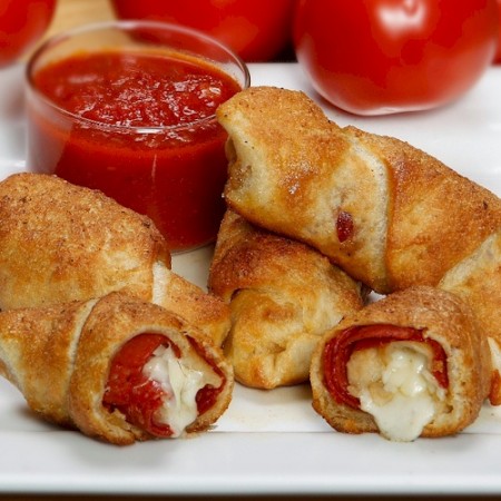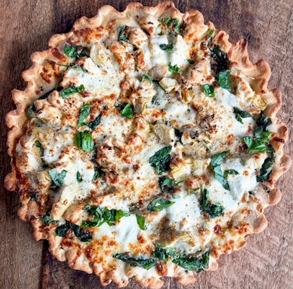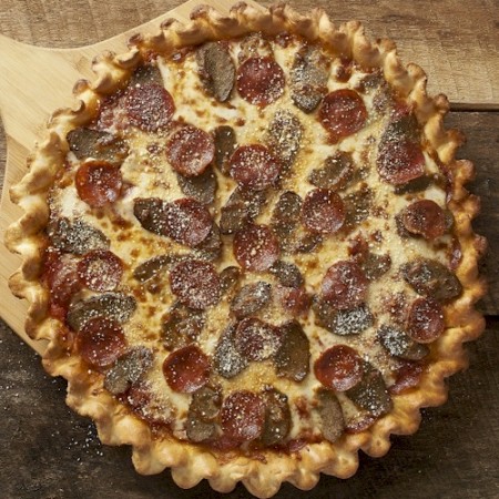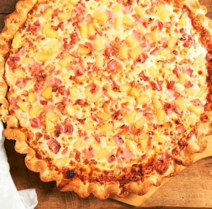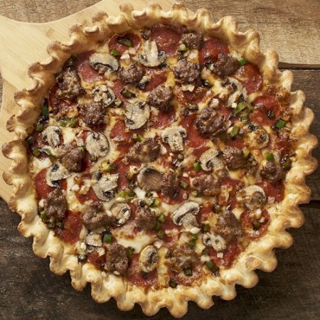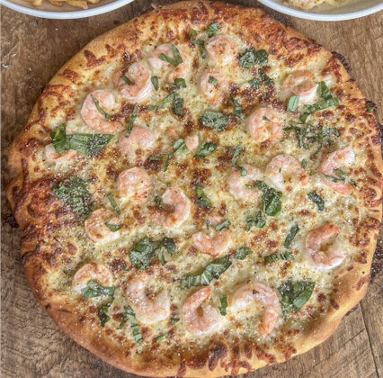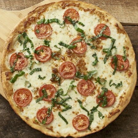 Pizzas available in 12" eight-piece or 16" 12-piece size.